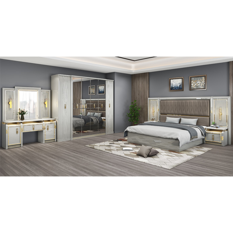 Foshan Cabrini Furniture Co., Ltd. is a renowned brand in the furniture industry, known for its innovative, luxurious, and elegant designs. The company has recently launched a new bedroom furniture set, which includes a king-size bed, two nightstands, a wardrobe, and a dressing table set. The furniture is made of high-quality medium-density fiberboard. The comfortable upholstered headboard, complemented by LED lighting and mirrored glass, not only looks beautiful and elegant but also enhances the overall ambiance and quality of the bedroom.